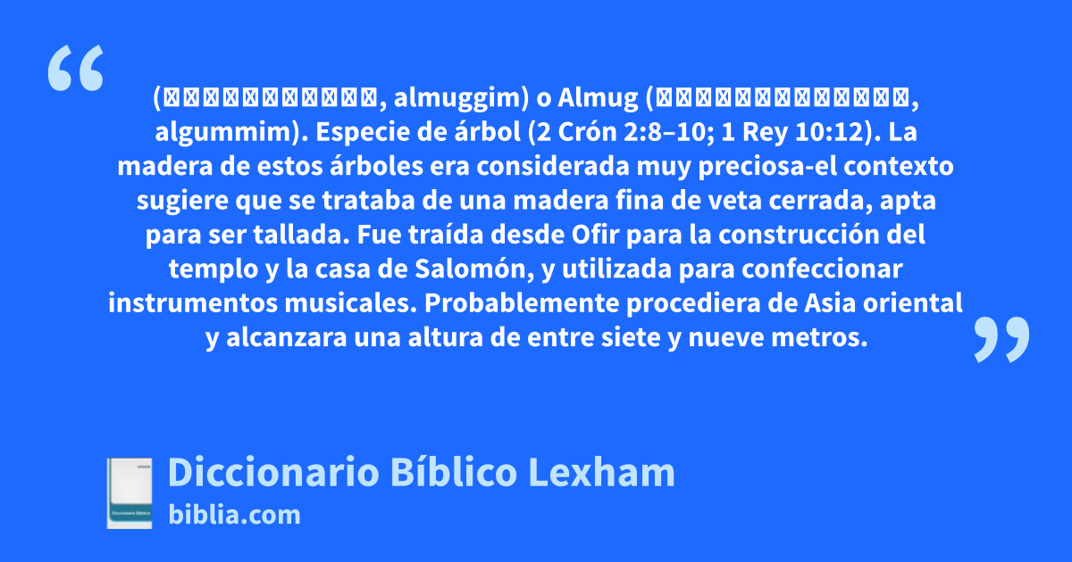 Almug (אַלְמֻגִּים, almuggim) o Almug (אַלְגּוּמִּים, algummim). Especie de árbol (2 Crón 2:8–10; 1 Rey 10:12). La madera de estos árboles era considerada muy preciosa-el contexto sugiere que se trataba de una madera fina de veta cerrada, apta para ser tallada. Fue traída desde Ofir para la construcción del templo y la casa de Salomón, y utilizada para confeccionar instrumentos musicales. Probablemente procediera de Asia oriental y alcanzara una altura de entre siete y nueve metros.