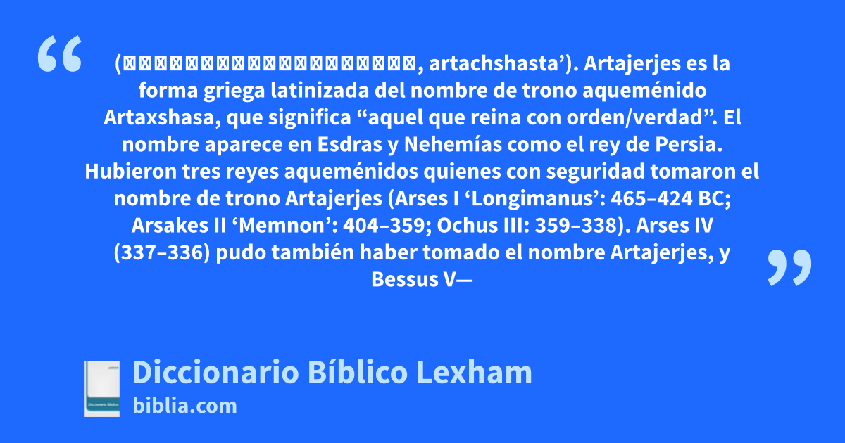 Artajerjes (אַרְתַּחְשַׁשְׂתָּא, artachshasta’). Artajerjes es la forma griega latinizada del nombre de trono aqueménido Artaxshasa, que significa “aquel que reina con orden/verdad”. El nombre aparece en Esdras y Nehemías como el rey de Persia. Hubieron tres reyes aqueménidos quienes con seguridad tomaron el nombre de trono Artajerjes (Arses I ‘Longimanus’: 465–424 BC; Arsakes II ‘Memnon’: 404–359; Ochus III: 359–338). Arses IV (337–336) pudo también haber tomado el nombre Artajerjes, y Bessus V—el asesino de Darío III—también lo usó brevemente (330 a.C.).