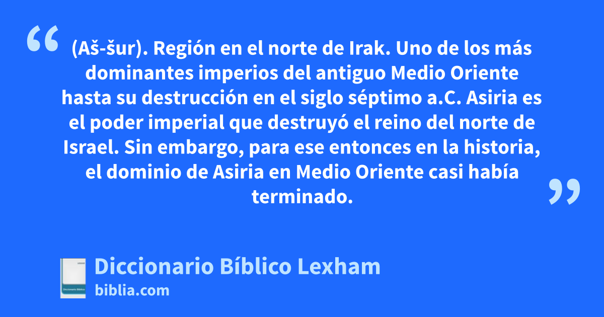 Asiria (Aš-šur). Región en el norte de Irak. Uno de los más dominantes imperios del antiguo Medio Oriente hasta su destrucción en el siglo séptimo a.C.