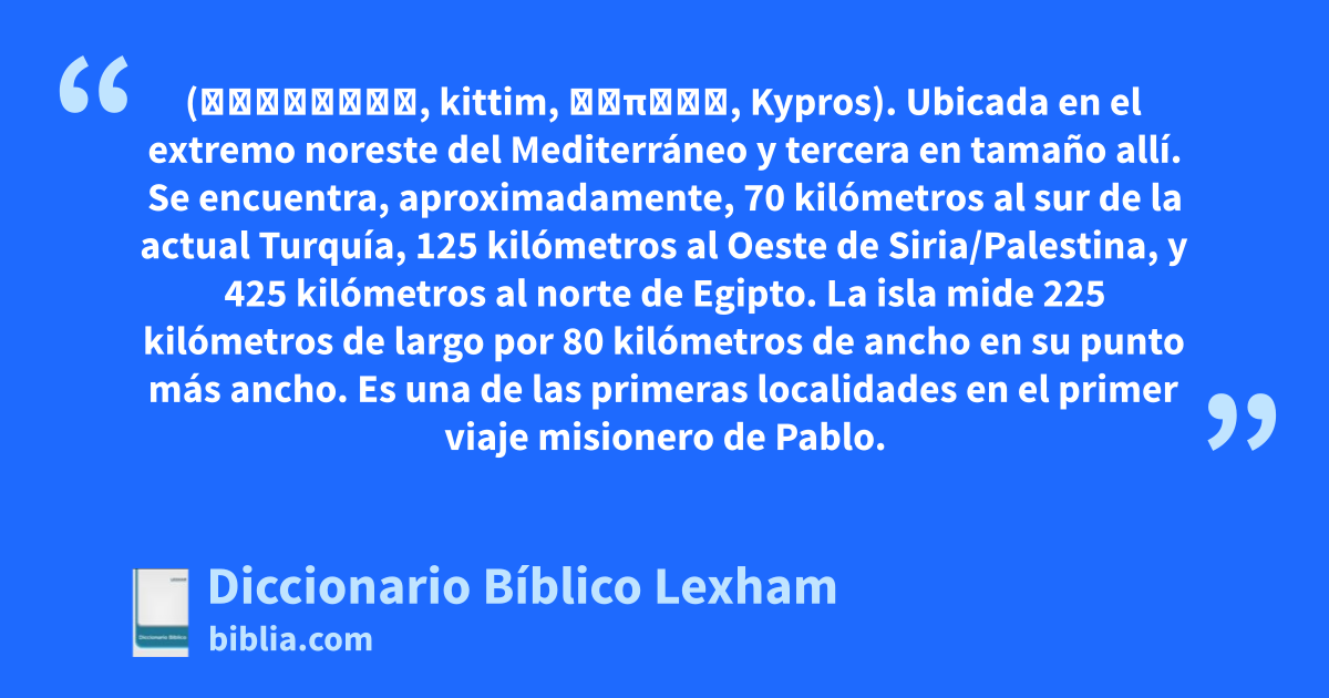 Chipre (כִּתִּים, kittim, Κύπρος, Kypros). Ubicada en el extremo noreste del Mediterráneo y tercera en tamaño allí. Se encuentra, aproximadamente, 70 kilómetros al sur de la actual Turquía, 125 kilómetros al Oeste de Siria/Palestina, y 425 kilómetros al norte de Egipto. La isla mide 225 kilómetros de largo por 80 kilómetros de ancho en su punto más ancho. Es una de las primeras localidades en el primer viaje misionero de Pablo.