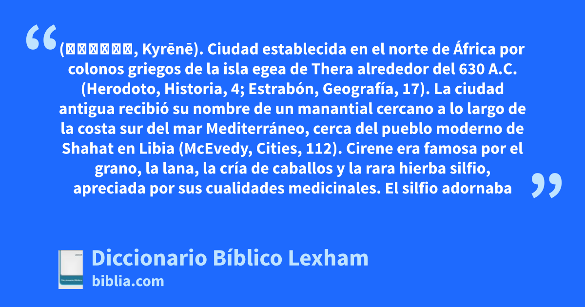 Cirene (Κυρήνη, Kyrēnē). Ciudad establecida en el norte de África por colonos griegos de la isla egea de Thera alrededor del 630 a.C. (Herodoto, Historia, 4; Estrabón, Geografía, 17). La ciudad antigua recibió su nombre de un manantial cercano a lo largo de la costa sur del mar Mediterráneo, cerca del pueblo moderno de Shahat en Libia (McEvedy, Cities, 112).