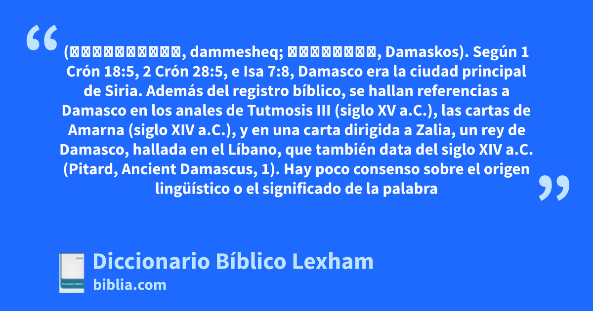 Damasco (דַּמֶּשֶׁק, dammesheq; Δαμασκός, Damaskos). Según 1 Crón 18:5, 2 Crón 28:5, e Isa 7:8, Damasco era la ciudad principal de Siria. Además del registro bíblico, se hallan referencias a Damasco en los anales de Tutmosis III (siglo XV a.C.), las cartas de Amarna (siglo XIV a.C.), y en una carta dirigida a Zalia, un rey de Damasco, hallada en el Líbano, que también data del siglo XIV a.C. (Pitard, Ancient Damascus, 1). Hay poco consenso sobre el origen lingüístico o el significado de la palabra “Damasco” (Pitard, Ancient Damascus, 7).
