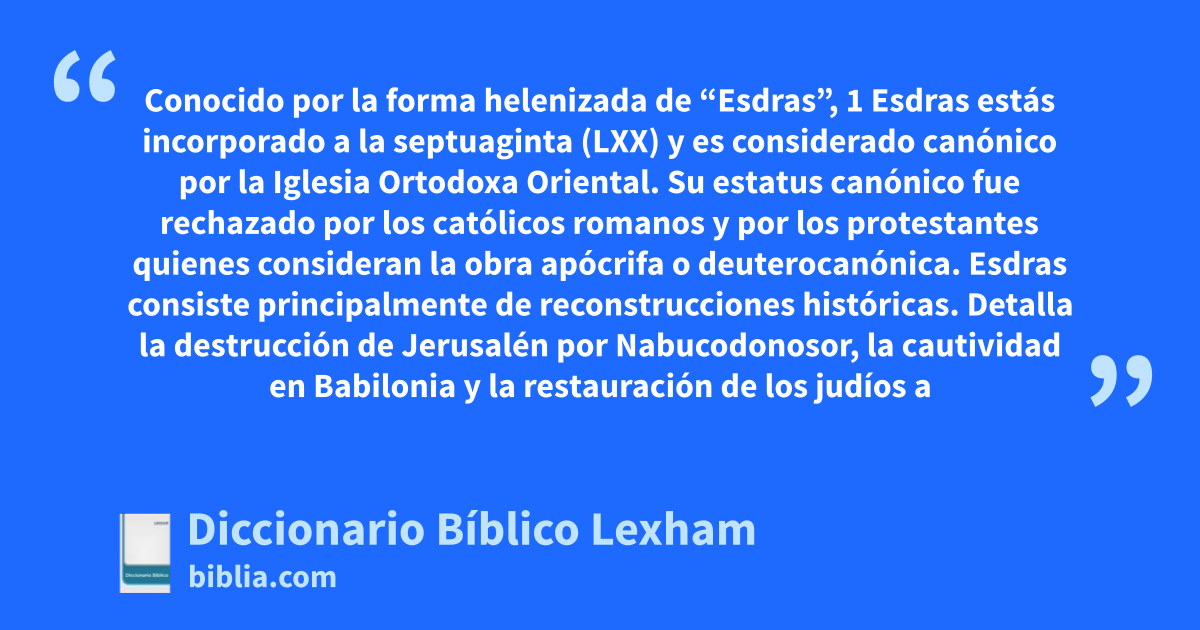Resumen breve de contenido. Conocido por la forma helenizada de “Esdras”, 1 Esdras estás incorporado a la septuaginta (LXX) y es considerado canónico por la Iglesia Ortodoxa Oriental. Su estatus canónico fue rechazado por los católicos romanos y por los protestantes quienes consideran la obra apócrifa o deuterocanónica.