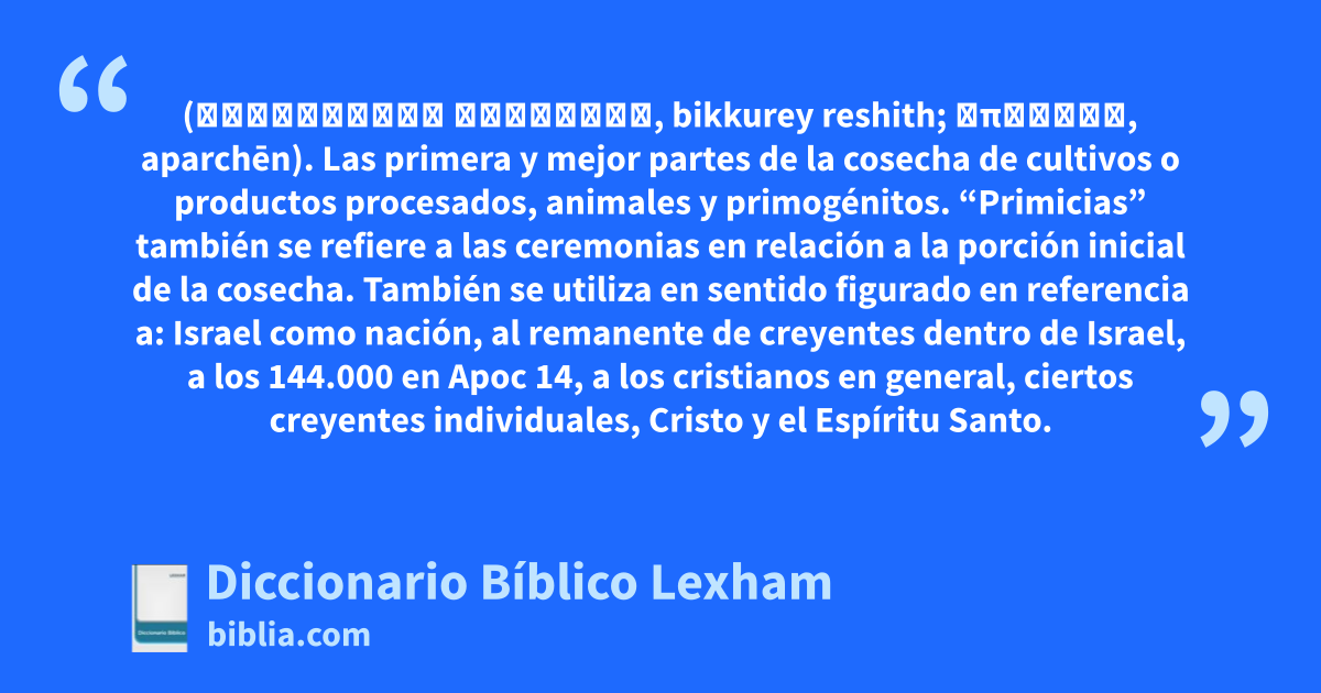 Primicias (בִּכּוּרֵי רֵאשִׁית, bikkurey reshith; ἀπαρχήν, aparchēn). Las primera y mejor partes de la cosecha de cultivos o productos procesados, animales y primogénitos. “Primicias” también se refiere a las ceremonias en relación a la porción inicial de la cosecha. También se utiliza en sentido figurado en referencia a: Israel como nación, al remanente de creyentes dentro de Israel, a los 144.000 en Apoc 14, a los cristianos en general, ciertos creyentes individuales, Cristo y el Espíritu Santo.