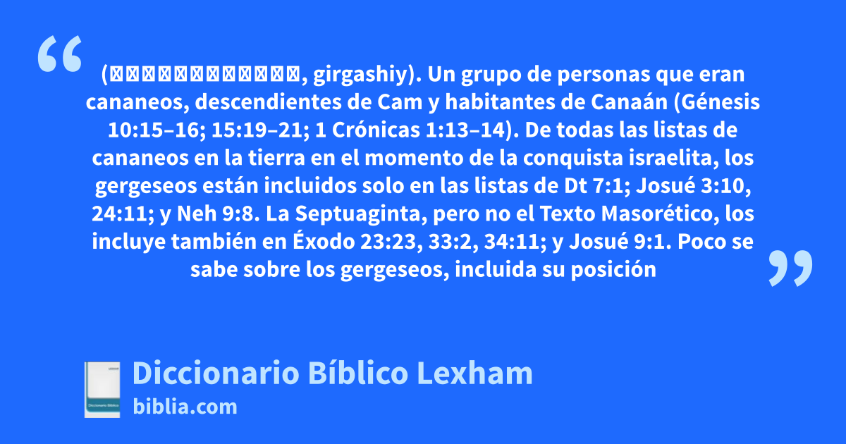 Gergeseos (גִּרְגָּשִׁי, girgashiy). Un grupo de personas que eran cananeos, descendientes de Cam y habitantes de Canaán (Génesis 10:15–16; 15:19–21; 1 Crónicas 1:13–14).