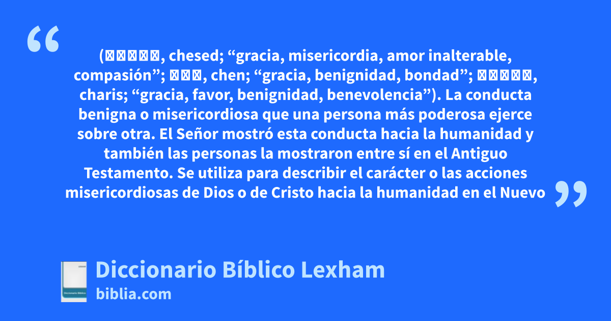 Gracia (חֶסֶד, chesed; “gracia, misericordia, amor inalterable, compasión”; חֵן, chen; “gracia, benignidad, bondad”; χάρις, charis; “gracia, favor, benignidad, benevolencia”). La conducta benigna o misericordiosa que una persona más poderosa ejerce sobre otra. El Señor mostró esta conducta hacia la humanidad y también las personas la mostraron entre sí en el Antiguo Testamento. Se utiliza para describir el carácter o las acciones misericordiosas de Dios o de Cristo hacia la humanidad en el Nuevo Testamento. Los dones espirituales se describen como “por gracia”. Recurso literario usado al comienzo y al final de muchas cartas del Nuevo Testamento.