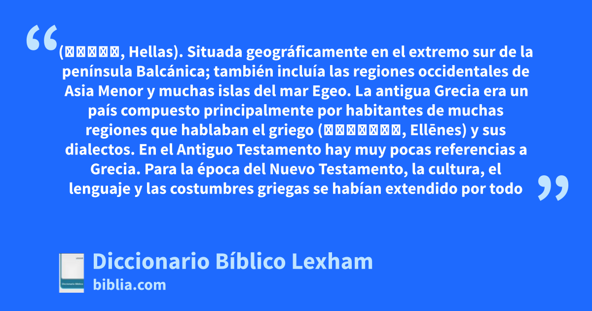 Grecia (Ἑλλάς, Hellas). Situada geográficamente en el extremo sur de la península Balcánica; también incluía las regiones occidentales de Asia Menor y muchas islas del mar Egeo. La antigua Grecia era un país compuesto principalmente por habitantes de muchas regiones que hablaban el griego (Ἐλληνες, Ellēnes) y sus dialectos. En el Antiguo Testamento hay muy pocas referencias a Grecia. Para la época del Nuevo Testamento, la cultura, el lenguaje y las costumbres griegas se habían extendido por todo el mundo antiguo. Esta “helenización” del mundo antiguo acompañó a las conquistas de Alejandro el Grande, quien impuso la cultura griega en todo su dominio. El idioma griego fue la lingua franca del mundo grecorromano y también el idioma del Nuevo Testamento.