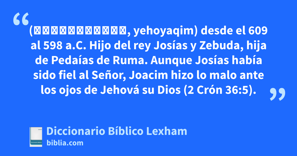Joacim, rey (יְהוֹיָקִים, yehoyaqim) desde el 609 al 598 a.C. Hijo del rey Josías y Zebuda, hija de Pedaías de Ruma. Aunque Josías había sido fiel al Señor, Joacim hizo lo malo ante los ojos de Jehová su Dios (2 Crón 36:5).