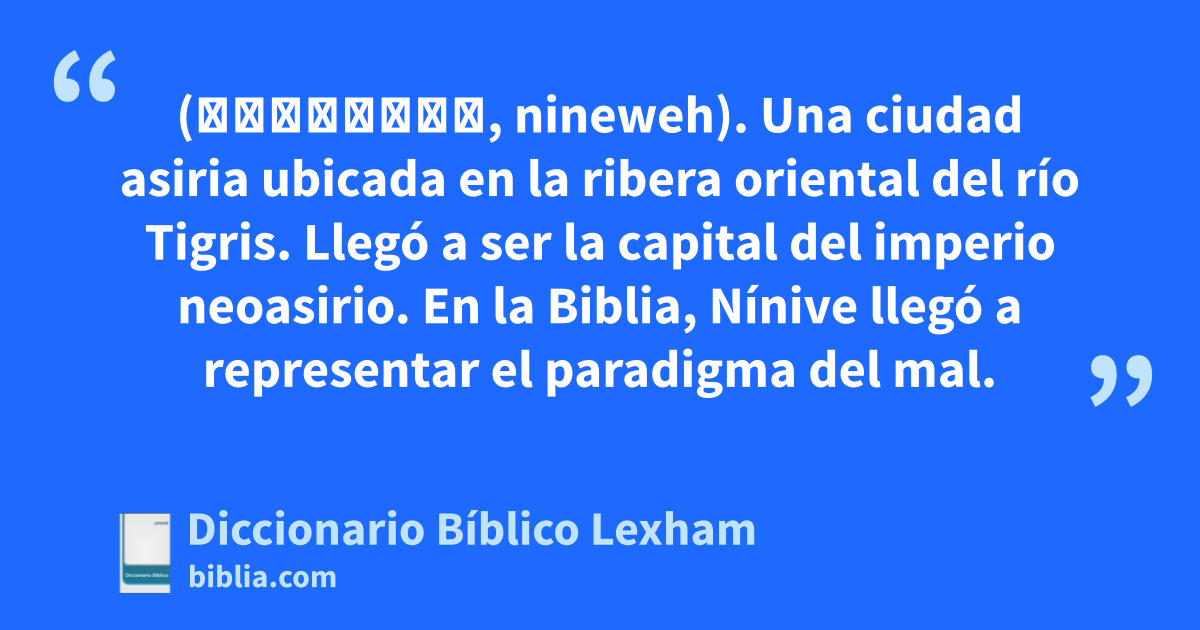 Nínive (נִינְוֵה, nineweh). Una ciudad asiria ubicada en la ribera oriental del río Tigris. Llegó a ser la capital del imperio neoasirio. En la Biblia, Nínive llegó a representar el paradigma del mal.