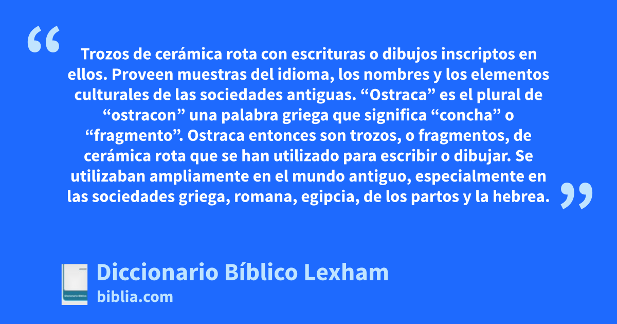 “Ostraca” es el plural de “ostracon” una palabra griega que significa “concha” o “fragmento”. Ostraca entonces son trozos, o fragmentos, de cerámica rota que se han utilizado para escribir o dibujar. Se utilizaban ampliamente en el mundo antiguo, especialmente en las sociedades griega, romana, egipcia, de los partos y la hebrea. Los ostraca, eran comunes por la fragilidad de las vasijas de arcilla, proveían material accesible y gratuito para escribir; a diferencia de los pergaminos o papiros, que eran muy costosos. Los textos o dibujos sobre ostraca se hacían con tinta o alguna herramienta filosa. Debido a su tamaño relativamente pequeño y a su naturaleza resistente era ideal para llevar registros, informes breves, notas, recibos de bienes y documentos impositivos.