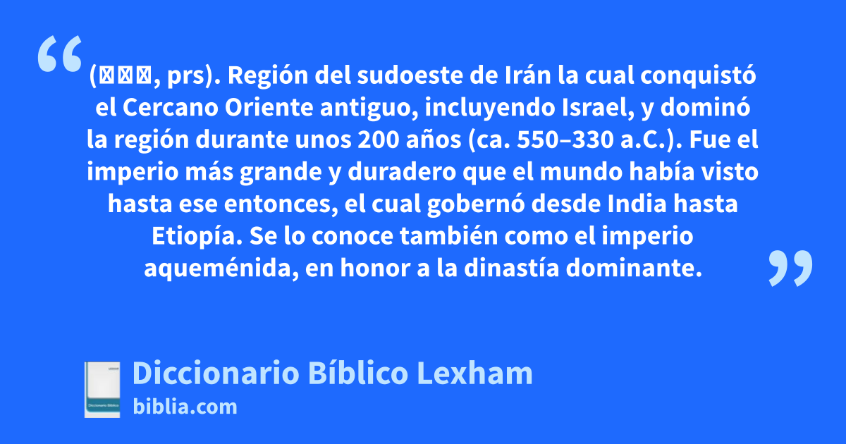Persia (פרס, prs). Región del sudoeste de Irán la cual conquistó el Cercano Oriente antiguo, incluyendo Israel, y dominó la región durante unos 200 años (ca. 550–330 a.C.). Fue el imperio más grande y duradero que el mundo había visto hasta ese entonces, el cual gobernó desde India hasta Etiopía. Se lo conoce también como el imperio aqueménida, en honor a la dinastía dominante.
