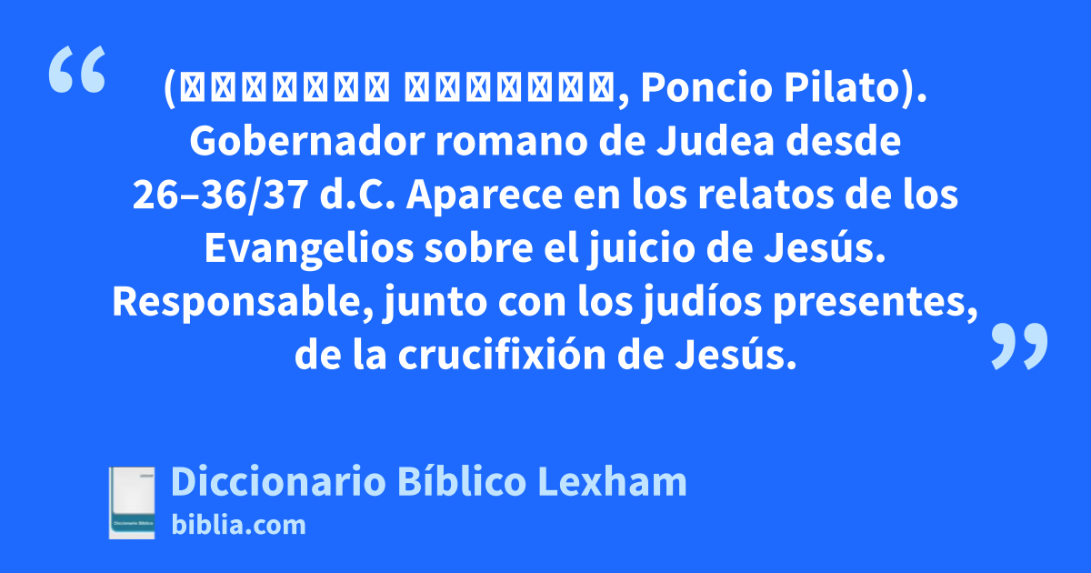 Pilato, Poncio (Πόντιος Πιλᾶτος, Poncio Pilato). Gobernador romano de Judea desde 26–36/37 d.C. Aparece en los relatos de los Evangelios sobre el juicio de Jesús. Responsable, junto con los judíos presentes, de la crucifixión de Jesús.