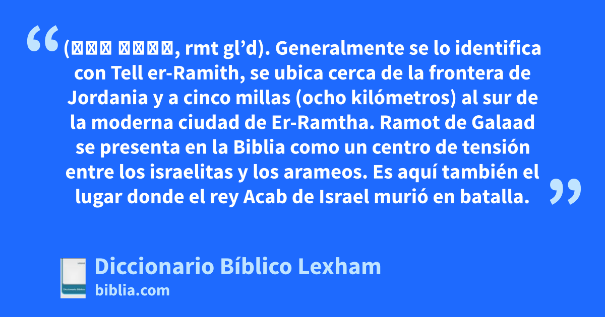 Ramot en Galaad (רמת גלעד, rmt gl’d). Generalmente se lo identifica con Tell er-Ramith, se ubica cerca de la frontera de Jordania y a cinco millas (ocho kilómetros) al sur de la moderna ciudad de Er-Ramtha. Ramot de Galaad se presenta en la Biblia como un centro de tensión entre los israelitas y los arameos. Es aquí también el lugar donde el rey Acab de Israel murió en batalla.
