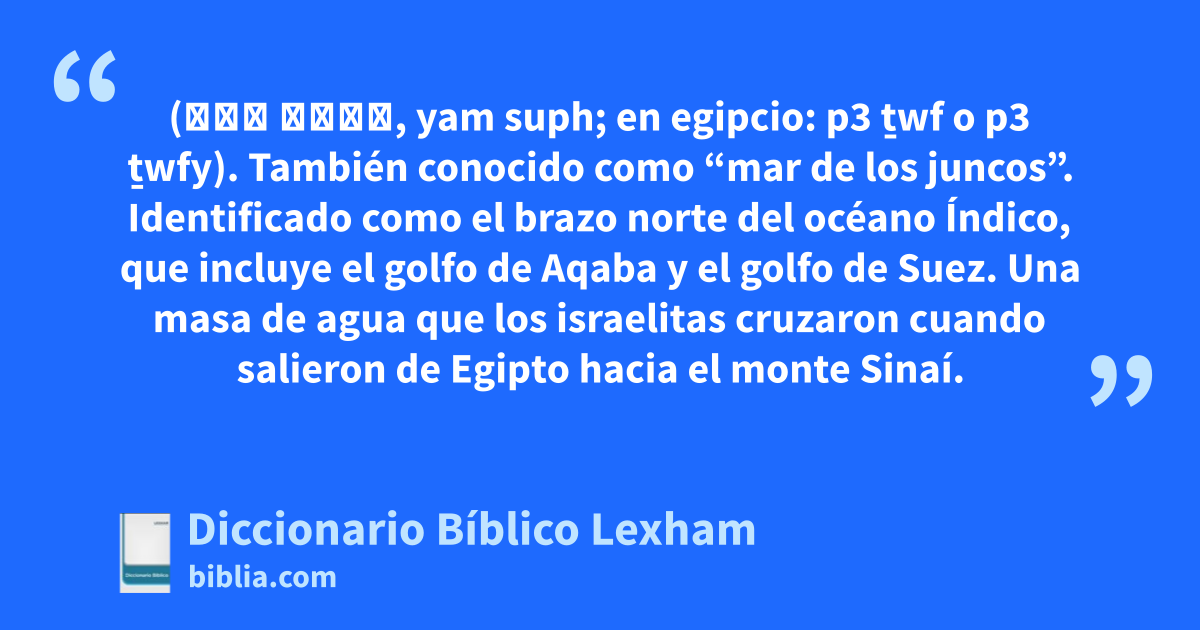 Mar Rojo (יָם סוּף, yam suph; en egipcio: p3 ṯwf o p3 ṯwfy). También conocido como “mar de los juncos”. Identificado como el brazo norte del océano Índico, que incluye el golfo de Aqaba y el golfo de Suez. Una masa de agua que los israelitas cruzaron cuando salieron de Egipto hacia el monte Sinaí.