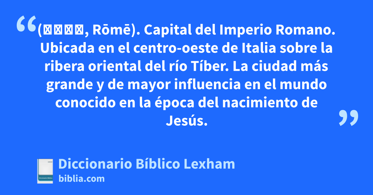 Roma, Ciudad de (Ρώμη, Rōmē). Capital del Imperio Romano. Ubicada en el centro-oeste de Italia sobre la ribera oriental del río Tíber. La ciudad más grande y de mayor influencia en el mundo conocido en la época del nacimiento de Jesús.