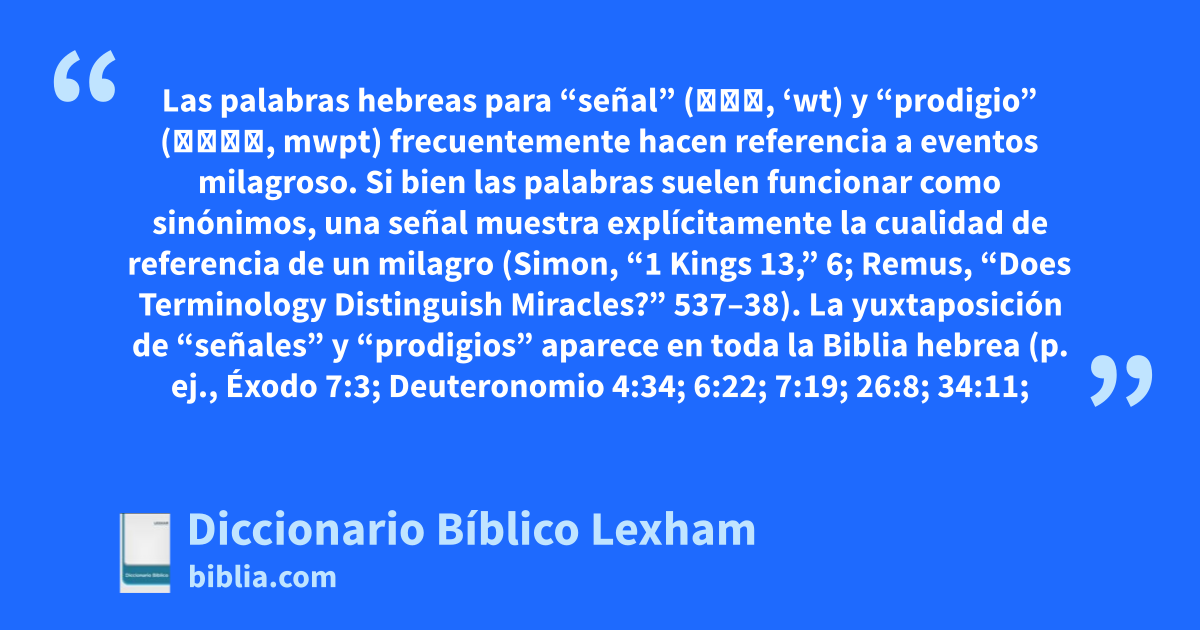Las palabras hebreas para “señal” (אות, ‘wt) y “prodigio” (מופת, mwpt) frecuentemente hacen referencia a eventos milagroso. Si bien las palabras suelen funcionar como sinónimos, una señal muestra explícitamente la cualidad de referencia de un milagro (Simon, “1 Kings 13,” 6; Remus, “Does Terminology Distinguish Miracles?” 537–38). La yuxtaposición de “señales” y “prodigios” aparece en toda la Biblia hebrea (p. ej., Éxodo 7:3; Deuteronomio 4:34; 6:22; 7:19; 26:8; 34:11; Is 8:18; Jer 32:20–21; Kee, Medicine, Miracles and Magic, 11).