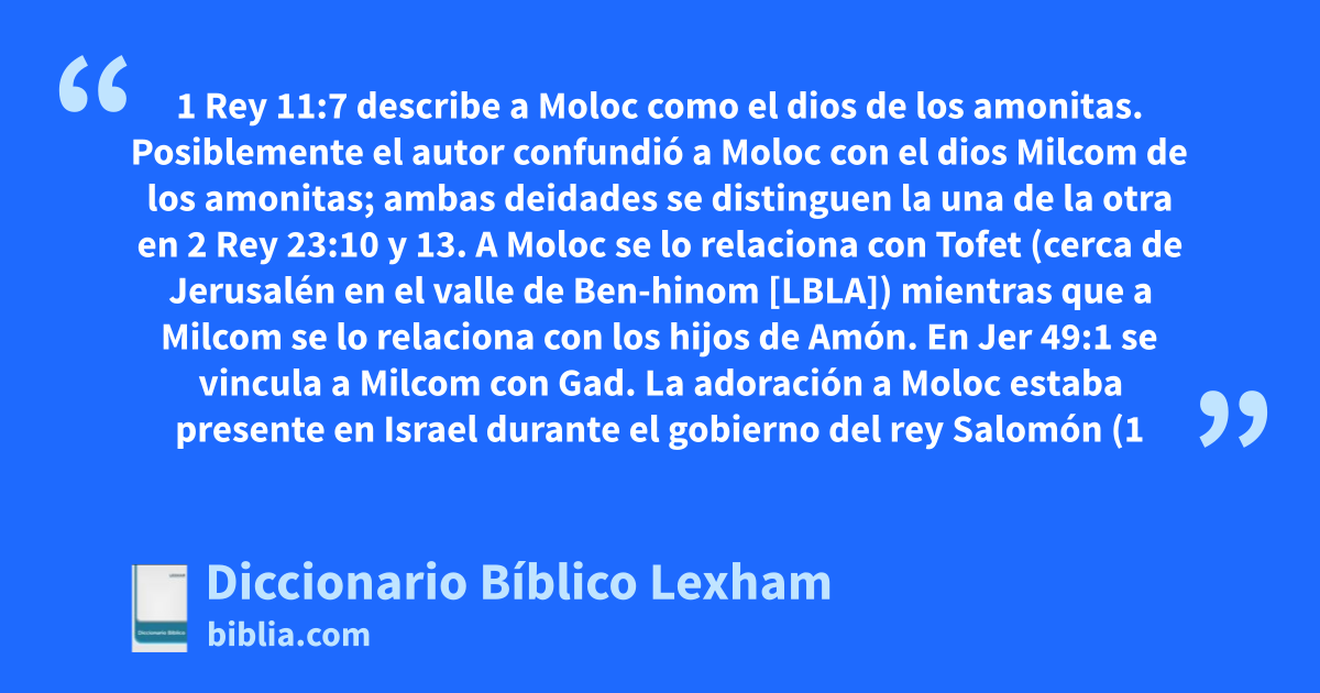 1 Rey 11:7 describe a Moloc como el dios de los amonitas. Posiblemente el autor confundió a Moloc con el dios Milcom de los amonitas; ambas deidades se distinguen la una de la otra en 2 Rey 23:10 y 13. A Moloc se lo relaciona con Tofet (cerca de Jerusalén en el valle de Ben-hinom [LBLA]) mientras que a Milcom se lo relaciona con los hijos de Amón. En Jer 49:1 se vincula a Milcom con Gad. La adoración a Moloc estaba presente en Israel durante el gobierno del rey Salomón (1 Rey 11:7) y se suspendió por las reformas de Josías en el siglo séptimo a.C. (2 Rey 23:13).