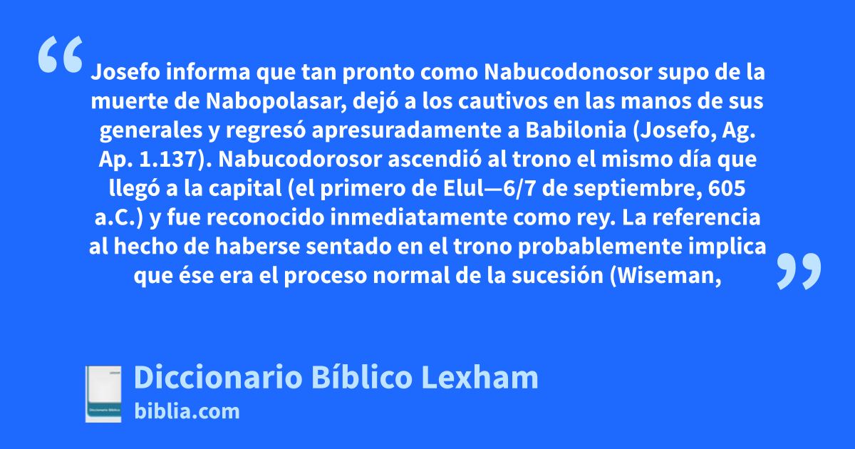 El rey Nabucodonosor. Josefo informa que tan pronto como Nabucodonosor supo de la muerte de Nabopolasar, dejó a los cautivos en las manos de sus generales y regresó apresuradamente a Babilonia (Josefo, Ag. Ap. 1.137). Nabucodorosor ascendió al trono el mismo día que llegó a la capital (el primero de Elul—6/7 de septiembre, 605 a.C.) y fue reconocido inmediatamente como rey. La referencia al hecho de haberse sentado en el trono probablemente implica que ése era el proceso normal de la sucesión (Wiseman, Nebuchadrezzar and Babylon, 19).