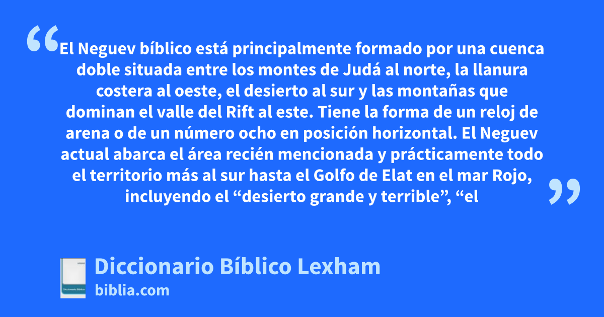 El Neguev bíblico está principalmente formado por una cuenca doble situada entre los montes de Judá al norte, la llanura costera al oeste, el desierto al sur y las montañas que dominan el valle del Rift al este. Tiene la forma de un reloj de arena o de un número ocho en posición horizontal. El Neguev actual abarca el área recién mencionada y prácticamente todo el territorio más al sur hasta el Golfo de Elat en el mar Rojo, incluyendo el “desierto grande y terrible”, “el desierto de Sin”, y el “desierto de Parán”. Los altiplanos y las montañas rodean por completo al Neguev bíblico con excepción del lado occidental, donde existen solo unas pocas millas de costa frente al mar Mediterráneo (Aharoni, The Land of the Bible, 28)