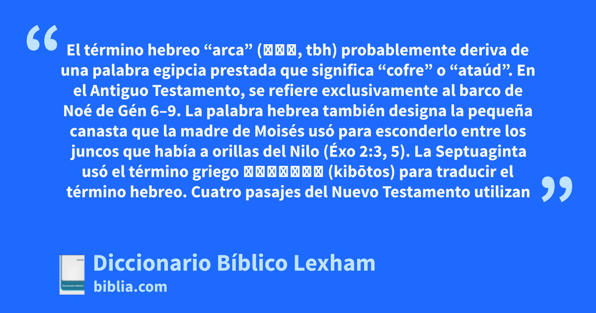 El término hebreo “arca” (תבה, tbh) probablemente deriva de una palabra egipcia prestada que significa “cofre” o “ataúd”. En el Antiguo Testamento, se refiere exclusivamente al barco de Noé de Gén 6–9. La palabra hebrea también designa la pequeña canasta que la madre de Moisés usó para esconderlo entre los juncos que había a orillas del Nilo (Éxo 2:3, 5).