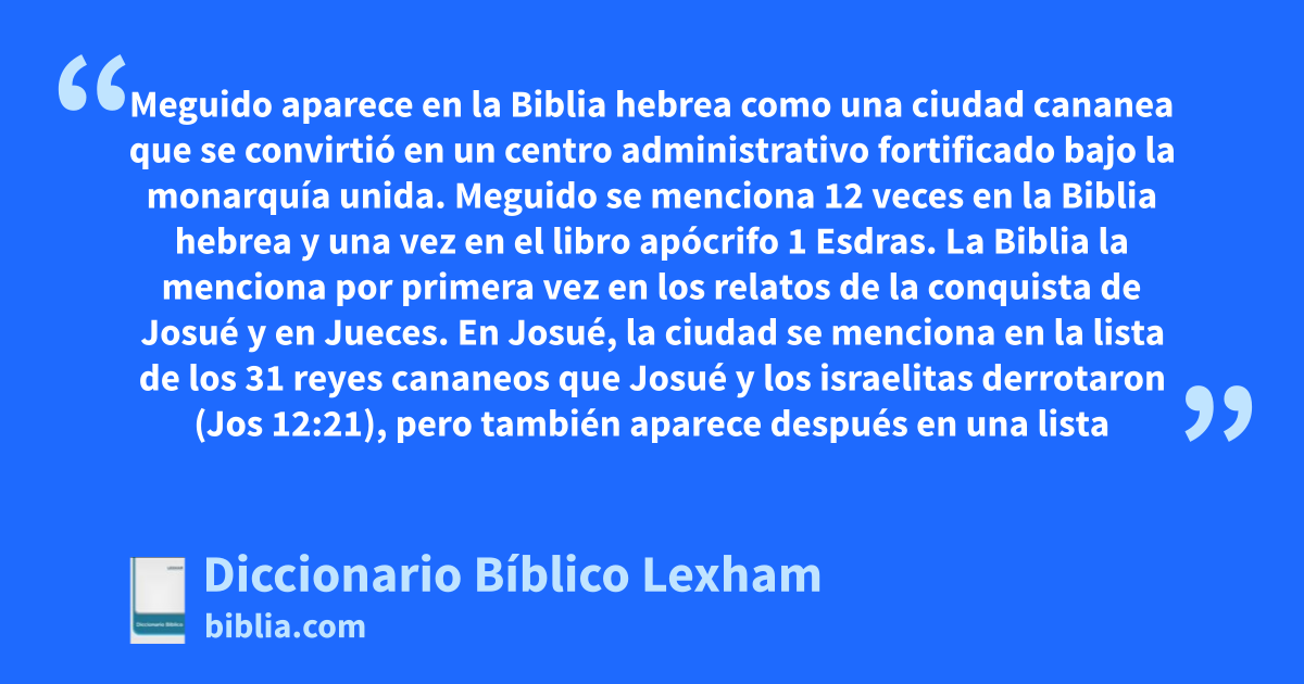 La siguiente referencia a Meguido se encuentra en la historiografía de la monarquía israelita, donde aparece como un centro administrativo fortificado del reino de Salomón (1 Rey 4:12; 9:15), gobernada por un oficial llamado Baana. Meguido vuelve a aparecer en el relato de la rebelión de Jehú para conquistar el trono de Israel (2 Rey 9:27). La última aparición de Meguido en los relatos históricos de la Biblia hebrea se encuentra en la narración de la muerte de Josías, el rey de Judá (2 Rey 23:29–30; 2 Crón 35:22; ver también 1 Esdr 1:25–33). En esta historia, Josías y su ejército, que supuestamente estaban aliados a los babilonios, intentaron impedir que Necao, el rey de Egipto, (probablemente Necao II, r. 610–595 a.C.) llegara a Asiria. Josías fue asesinado en los alrededores de Meguido. Este pasaje, como el relato de Tutmosis III, resalta la importancia de la ubicación de Meguido en la ruta a Mesopotamia. La aparición final de Meguido en la Biblia hebrea está en Zac 12:11, que describe un día de gran llanto en Jerusalén, semejante al “llanto de Hadadrimón en el valle de Meguido” (בבקעת מגדון, bbq’t mgdwn). El “Hadadrimón” aquí puede ser una referencia codificada a la muerte de Josías, una mención a Hadad, el dios semítico occidental de las tormentas, o una referencia toponímica a un pueblo (Meyers y Meyers, Zechariah 9–14, 342–44; Van de Velde, Narrative of a Journey, 355; id., Memoir, 333–34).