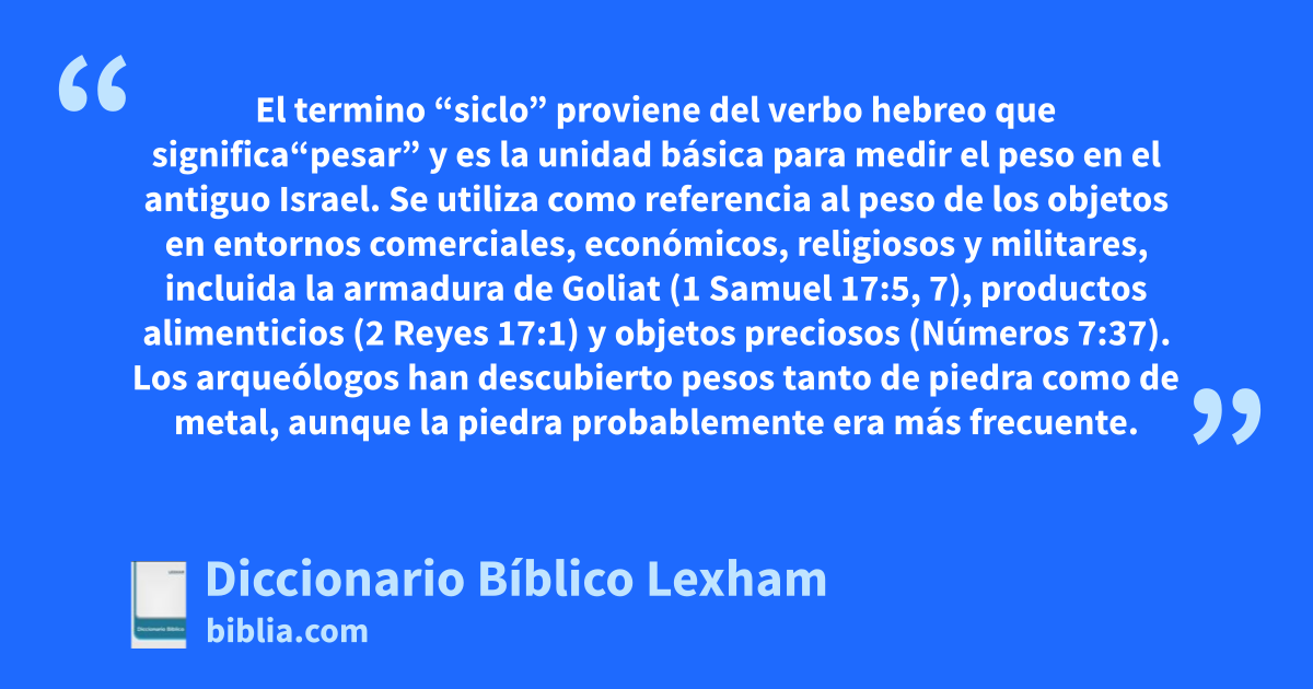 El termino “siclo” proviene del verbo hebreo que significa“pesar” y es la unidad básica para medir el peso en el antiguo Israel. Se utiliza como referencia al peso de los objetos en entornos comerciales, económicos, religiosos y militares, incluida la armadura de Goliat (1 Samuel 17:5, 7), productos alimenticios (2 Reyes 17:1) y objetos preciosos (Números 7:37).