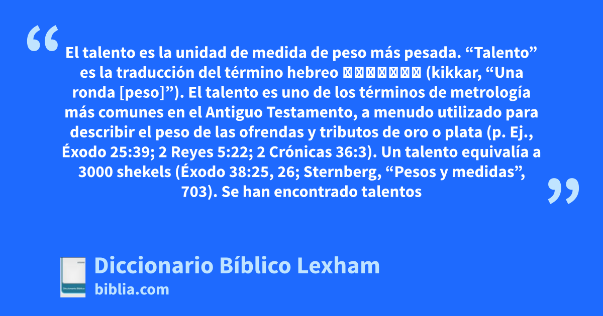 El talento es la unidad de medida de peso más pesada. “Talento” es la traducción del término hebreo כִּכָּר (kikkar, “Una ronda [peso]”). El talento es uno de los términos de metrología más comunes en el Antiguo Testamento, a menudo utilizado para describir el peso de las ofrendas y tributos de oro o plata (p. Ej., Éxodo 25:39; 2 Reyes 5:22; 2 Crónicas 36:3). Un talento equivalía a 3000 shekels (Éxodo 38:25, 26; Sternberg, “Pesos y medidas”, 703). Se han encontrado talentos con una variedad de pesos, lo que indica que se usaron diferentes sistemas a lo largo de la historia de Israel, pero el peso de un talento se fijó en aproximadamente 75 libras (34 kilogramos) durante el período del Segundo Templo (NIDOTTE2:636).