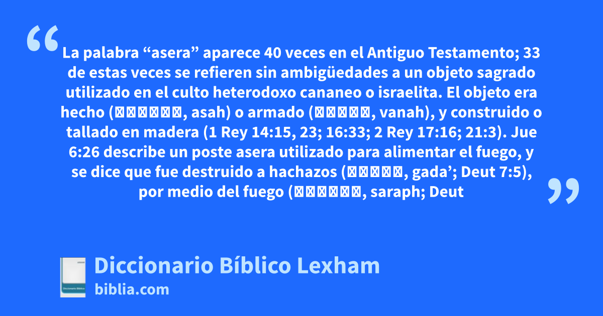 La palabra “asera” aparece 40 veces en el Antiguo Testamento; 33 de estas veces se refieren sin ambigüedades a un objeto sagrado utilizado en el culto heterodoxo cananeo o israelita. El objeto era hecho (עָשָׂה, asah) o armado (בָנָה, vanah), y construido o tallado en madera (1 Rey 14:15, 23; 16:33; 2 Rey 17:16; 21:3). Jue 6:26 describe un poste asera utilizado para alimentar el fuego, y se dice que fue destruido a hachazos (גָדָע, gada’; Deut 7:5), por medio del fuego (שָׂרַף, saraph; Deut 12:3; 2 Rey 23:6), cortándolo (כָרַת, kharath; Jue 6:25, 28, 30; 2 Rey 18:4) y arrancándolo (נָתַשׁ, nathash; Miq 5:14). Deut 16:21 prohíbe plantar (נָטָע, nata’) un “árbol de asera”, lo cual puede indicar que un árbol natural también podía servir como un asera.