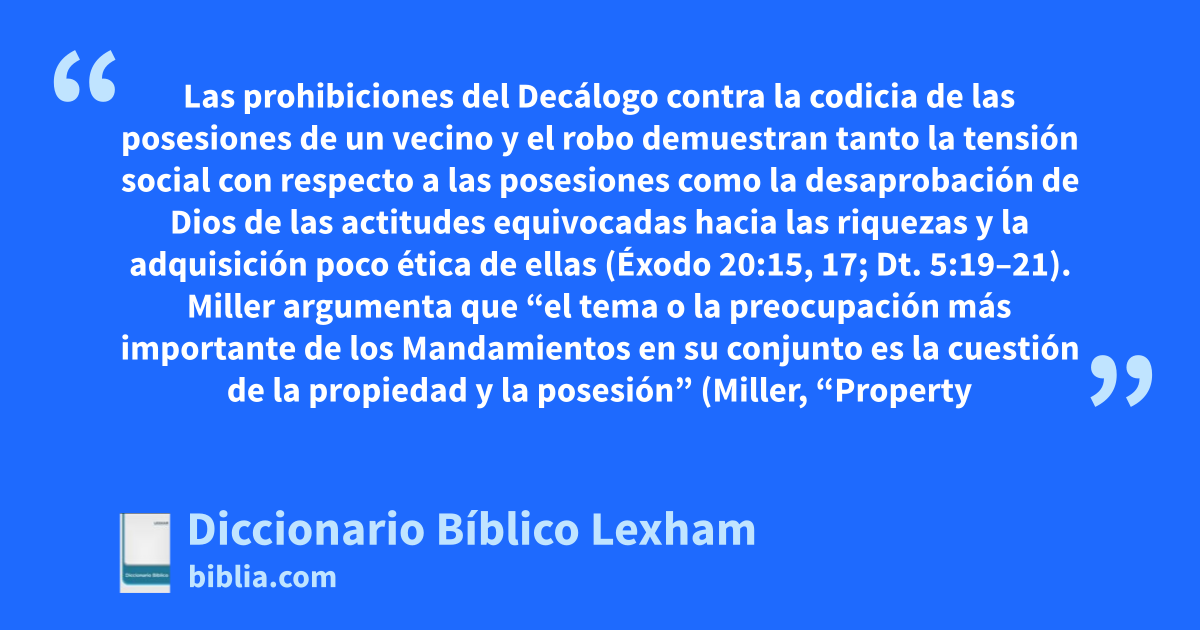 Las prohibiciones del Decálogo contra la codicia de las posesiones de un vecino y el robo demuestran tanto la tensión social con respecto a las posesiones como la desaprobación de Dios de las actitudes equivocadas hacia las riquezas y la adquisición poco ética de ellas (Éxodo 20:15, 17; Dt. 5:19–21). Miller argumenta que “el tema o la preocupación más importante de los Mandamientos en su conjunto es la cuestión de la propiedad y la posesión” (Miller, “Property and Possession”, 19–20). Al examinar el mandamiento contra el robo a la luz del concepto de la propiedad de Dios de todas los bienes, Kaiser concluye que “la imagen bíblica es aquella en la que la soberanía absoluta se atribuye solamente a Dios, mientras que las responsabilidades de administración se atribuyen a los seres humanos” (Kaiser, “Ownership and Property”, 227–28). Las tensiones sociales sobre la propiedad de la tierra también prevalecen en los relatos bíblicos de la monarquía antigua (por ejemplo, 1 Re. 21; Is. 5:8; Mi. 2:2) y en el período persa (por ejemplo, Neh. 5:1; Hengel, Property and Riches, 19).