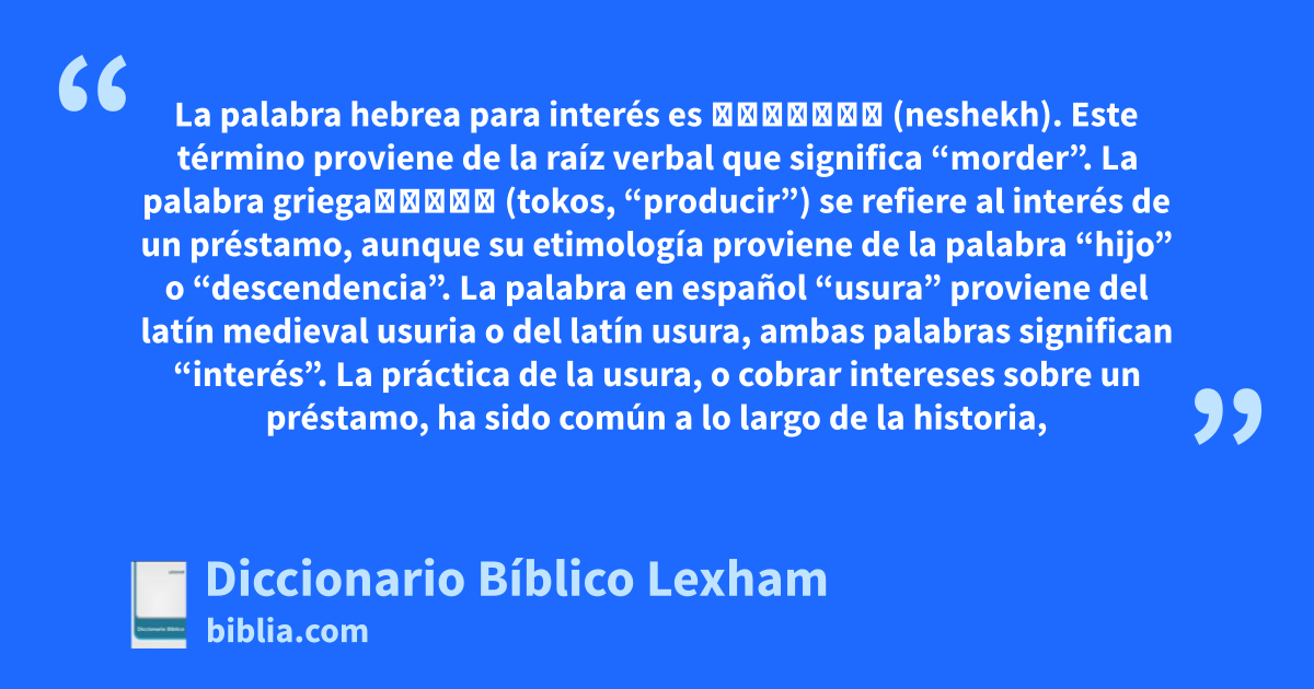 La palabra hebrea para interés es נֶשֶׁךְ (neshekh). Este término proviene de la raíz verbal que significa “morder”. La palabra griegaτόκος (tokos, “producir”) se refiere al interés de un préstamo, aunque su etimología proviene de la palabra “hijo” o “descendencia”. La palabra en español “usura” proviene del latín medieval usuria o del latín usura, ambas palabras significan “interés”. La práctica de la usura, o cobrar intereses sobre un préstamo, ha sido común a lo largo de la historia, aunque prohibida por ordenanza bíblica en Israel. Esta práctica permaneció constante durante la época de Cristo y en el período de la iglesia primitiva.