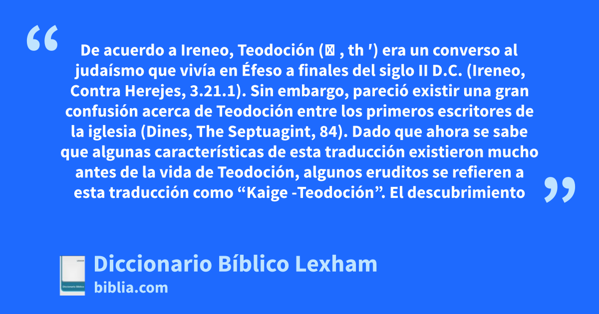 De acuerdo a Ireneo, Teodoción (θ , th ʹ) era un converso al judaísmo que vivía en Éfeso a finales del siglo II d.C. (Ireneo, Contra Herejes, 3.21.1). Sin embargo, pareció existir una gran confusión acerca de Teodoción entre los primeros escritores de la iglesia (Dines, The Septuagint, 84). Dado que ahora se sabe que algunas características de esta traducción existieron mucho antes de la vida de Teodoción, algunos eruditos se refieren a esta traducción como “Kaige -Teodoción”. El descubrimiento de un fragmento de los Profetas menores en griego se encuentra en Naḥal Ḥever (8QḤevXIIgr) cerca del Mar Muerto con estas características las cuales han llevado a estudiosos como Bartolomé a concluir que no existía en el segundo siglo un “Teodoción”, sino únicamente “en el primer siglo Kaige el editor” (citado en Dines, Septuagint, 81). Es probable que la traducción de Daniel identificada como de Teodoción es de una fuente diferente (Di Lella, Daniel, 81–82). Cualquiera que sea el caso, Teodoción solo se conoce por unos pocos comentarios y citas marginales, además de la traducción de Daniel que eventualmente reemplazó a la versión griega antigua (Jobes y Silva, Invitation to the Septuagint, 41).