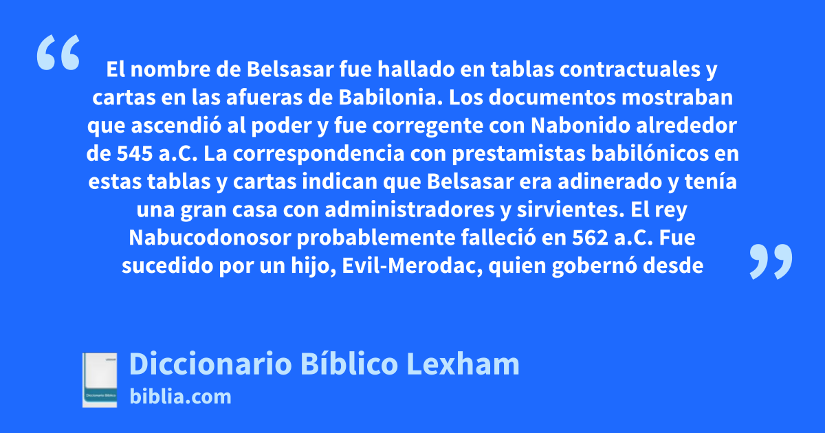 Ascenso de Belsasar al trono. El nombre de Belsasar fue hallado en tablas contractuales y cartas en las afueras de Babilonia. Los documentos mostraban que ascendió al poder y fue corregente con Nabonido alrededor de 545 a.C. La correspondencia con prestamistas babilónicos en estas tablas y cartas indican que Belsasar era adinerado y tenía una gran casa con administradores y sirvientes.