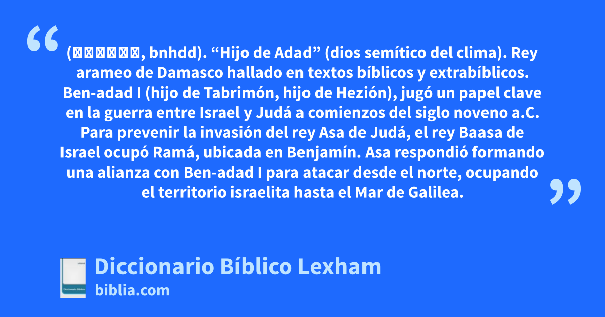 Ben-adad I (בן־הדד, bnhdd). “Hijo de Adad” (dios semítico del clima). Rey arameo de Damasco hallado en textos bíblicos y extrabíblicos.