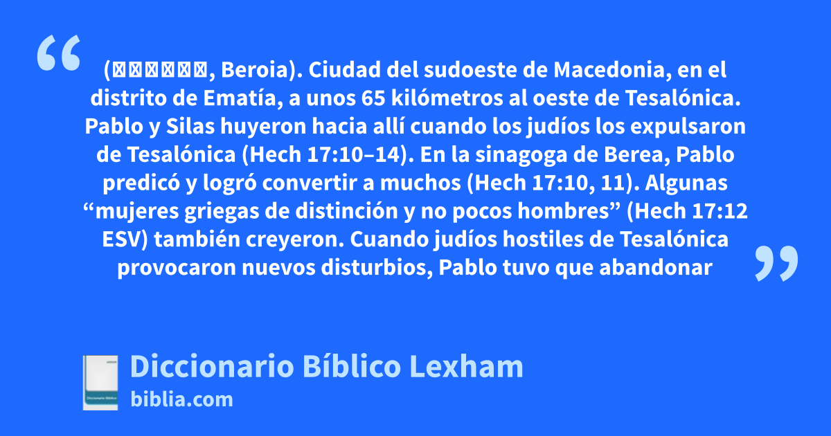 Berea de Macedonia (Βέροια, Beroia). Ciudad del sudoeste de Macedonia, en el distrito de Ematía, a unos 65 kilómetros al oeste de Tesalónica. Pablo y Silas huyeron hacia allí cuando los judíos los expulsaron de Tesalónica (Hech 17:10–14).