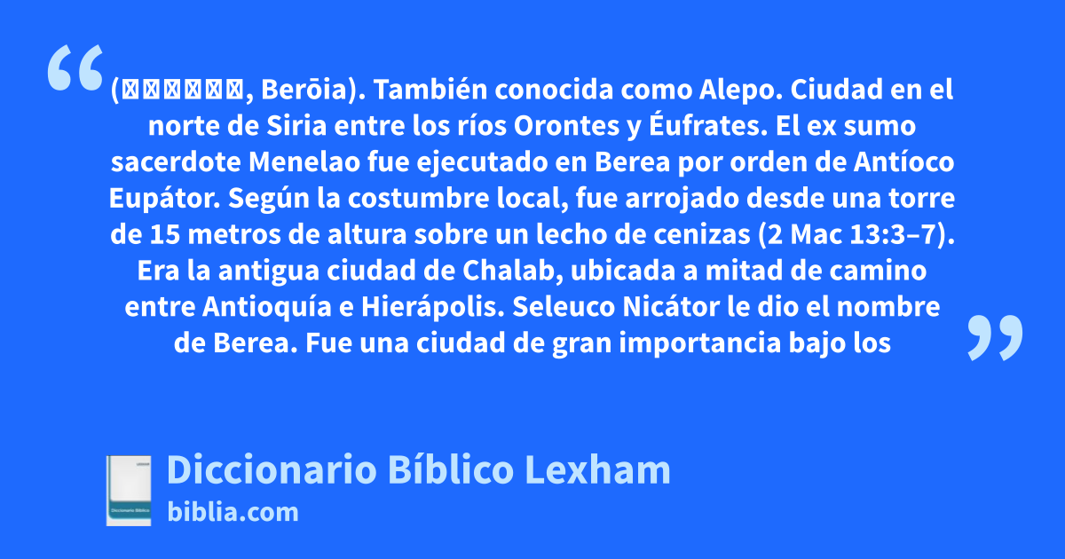 Berea, Alepo (Βερωια, Berōia). También conocida como Alepo. Ciudad en el norte de Siria entre los ríos Orontes y Éufrates.