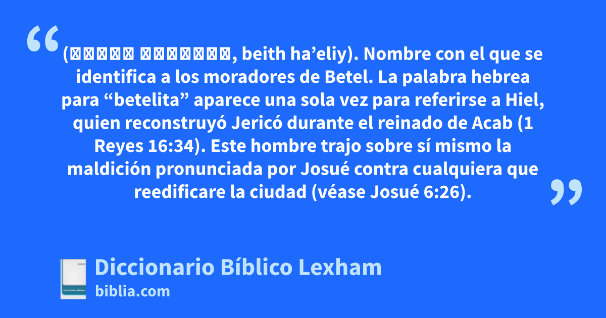 Betelitas (בֵּית הָאֱלִי, beith ha’eliy). Nombre con el que se identifica a los moradores de Betel. La palabra hebrea para “betelita” aparece una sola vez para referirse a Hiel, quien reconstruyó Jericó durante el reinado de Acab (1 Reyes 16:34). Este hombre trajo sobre sí mismo la maldición pronunciada por Josué contra cualquiera que reedificare la ciudad (véase Josué 6:26).