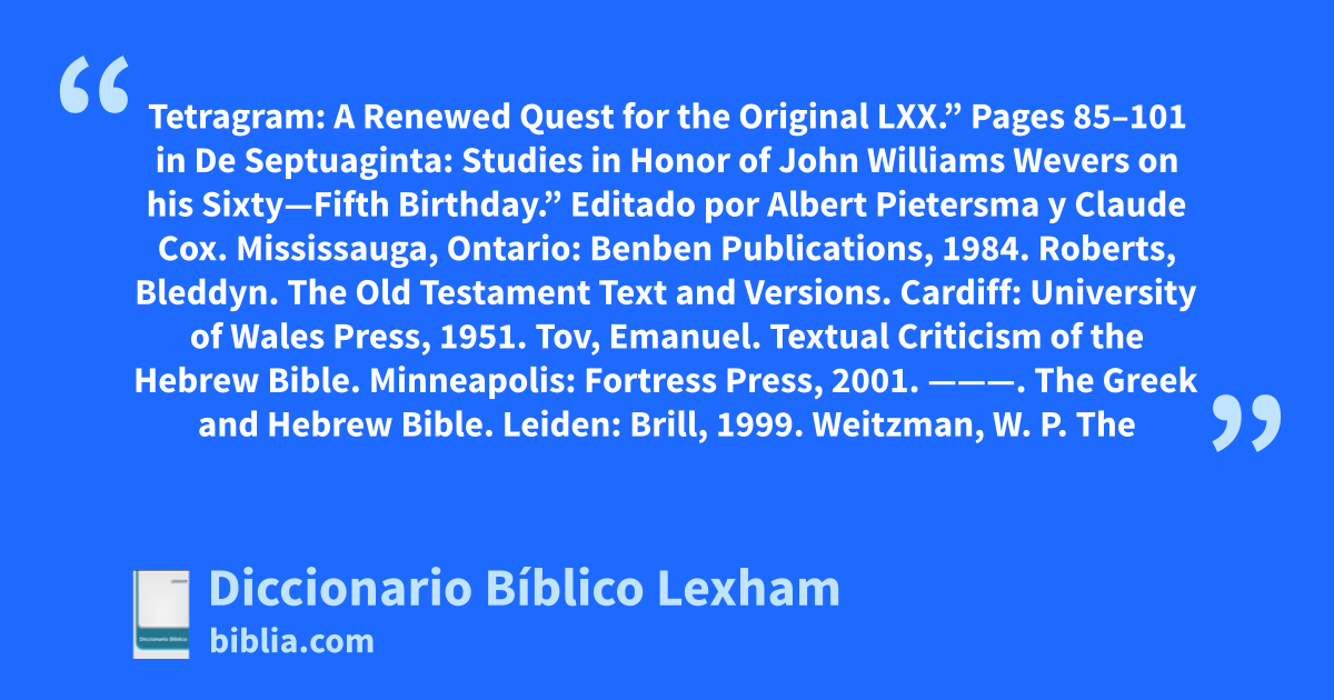 Pietersma, Albert. “Kyrios or Tetragram: A Renewed Quest for the Original LXX.” Pages 85–101 in De Septuaginta: Studies in Honor of John Williams Wevers on his Sixty—Fifth Birthday.” Editado por Albert Pietersma y Claude Cox. Mississauga, Ontario: Benben Publications, 1984.