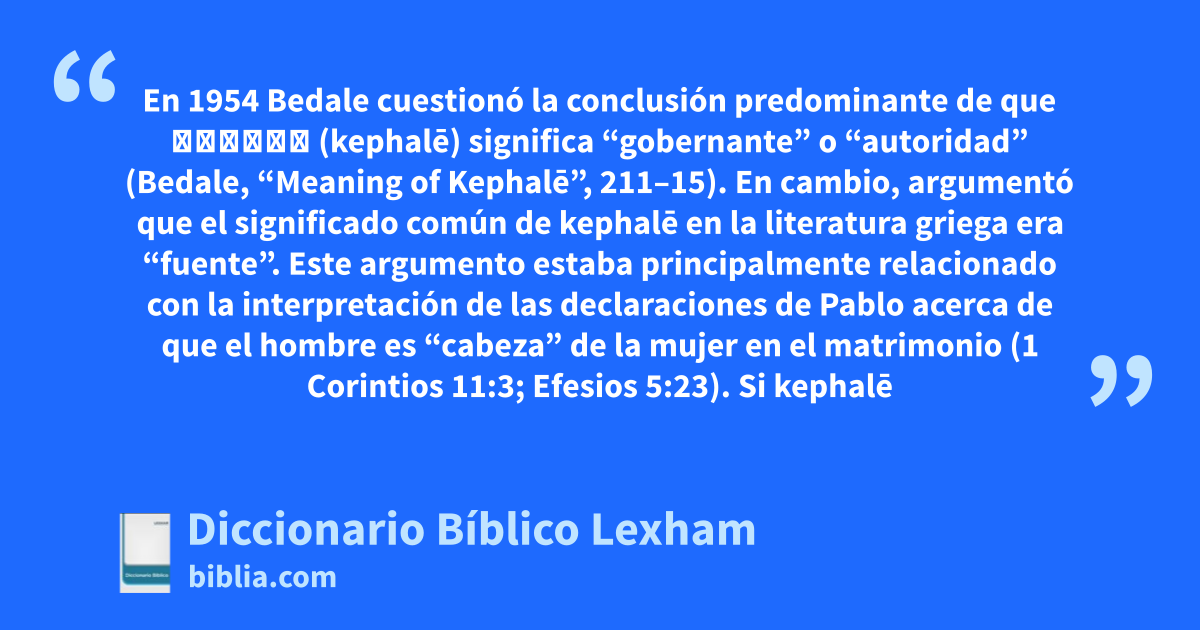 En 1954 Bedale cuestionó la conclusión predominante de que κεφαλή (kephalē) significa “gobernante” o “autoridad” (Bedale, “Meaning of Kephalē”, 211–15). En cambio, argumentó que el significado común de kephalē en la literatura griega era “fuente”. Este argumento estaba principalmente relacionado con la interpretación de las declaraciones de Pablo acerca de que el hombre es “cabeza” de la mujer en el matrimonio (1 Corintios 11:3; Efesios 5:23). Si kephalē connota “fuente” en lugar de “autoridad”, Pablo estaría diciendo que el hombre es la fuente de la mujer (es decir, que Eva fue tomada de Adán según Génesis 2:21–23) y que Cristo es la fuente de la Iglesia. Mickelsen y Mickelsen realizaron conclusiones similares en 1979 (“Does Male Dominance Tarnish Our Translations?,” 23–29).