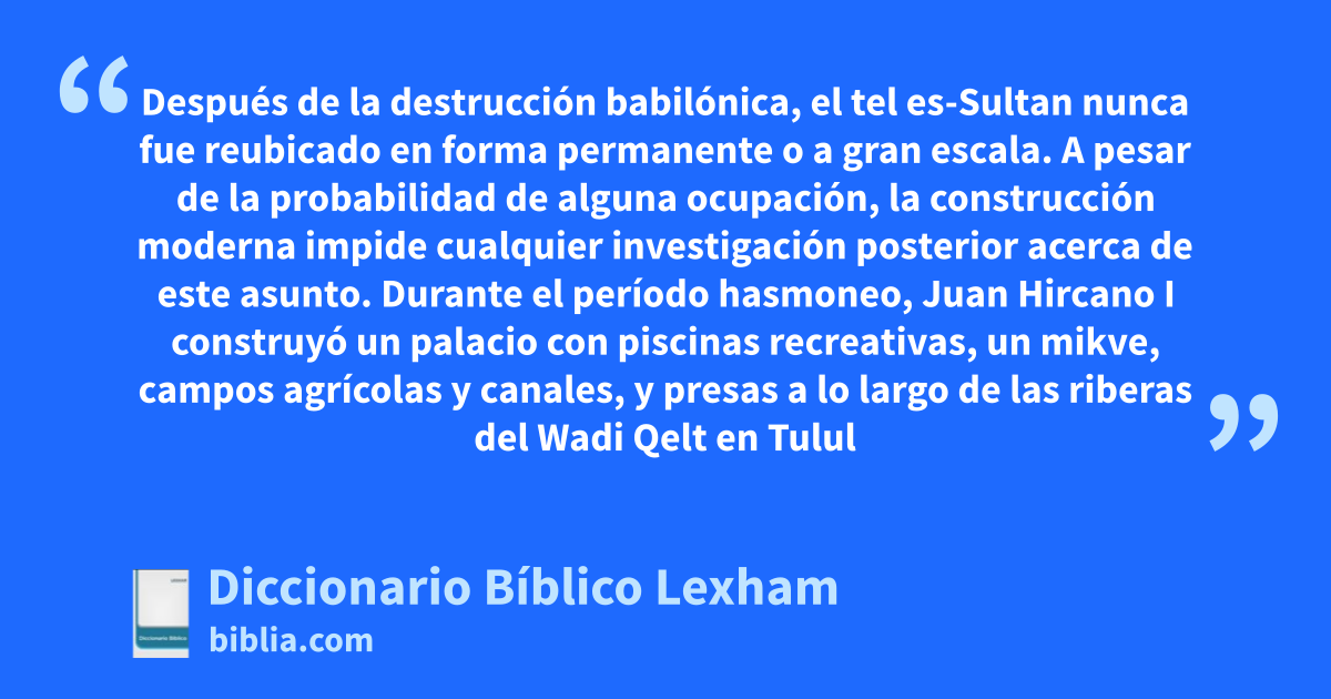 Ocupación en Tulul Abu el-’Alayiq en el período del segundo templo. Después de la destrucción babilónica, el tel es-Sultan nunca fue reubicado en forma permanente o a gran escala. A pesar de la probabilidad de alguna ocupación, la construcción moderna impide cualquier investigación posterior acerca de este asunto. Durante el período hasmoneo, Juan Hircano I construyó un palacio con piscinas recreativas, un mikve, campos agrícolas y canales, y presas a lo largo de las riberas del Wadi Qelt en Tulul Abu el-’Alayiq. Más tarde, Alejandro Janeo y Salomé Alejandra expandieron este palacio para su propio uso. Una vez que Herodes el Grande tomó posesión del territorio, construyó un palacio de invierno con un gran complejo de edificaciones y piscinas en la ribera contraria al palacio hasmoneo. Después de que el terremoto en 31 a.C. destruyera el palacio hasmoneo, construyó un segundo palacio sobre sus ruinas. Una expansión mayor en 15 a.C ensanchó el palacio hacia ambos lados del Wadi Qelt. La instalación contaba con un hipódromo, un teatro y posiblemente un gimnasio. Las construcciones residenciales fueron construidas en la región alrededor de estos complejos palaciegos (Netzer, “Tulul Abu el-’Alayiq, Exploration Until 1951”, 682–83; Netzer, “Tulul Abu el-’Alayiq, Exploration Since 1973”, 683–91).