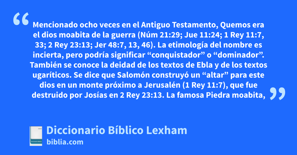 Quemos. Mencionado ocho veces en el Antiguo Testamento, Quemos era el dios moabita de la guerra (Núm 21:29; Jue 11:24; 1 Rey 11:7, 33; 2 Rey 23:13; Jer 48:7, 13, 46). La etimología del nombre es incierta, pero podría significar “conquistador” o “dominador”. También se conoce la deidad de los textos de Ebla y de los textos ugaríticos. Se dice que Salomón construyó un “altar” para este dios en un monte próximo a Jerusalén (1 Rey 11:7), que fue destruido por Josías en 2 Rey 23:13. La famosa Piedra moabita, también llamada Estela de Mesha, que data aproximadamente del 840 a.C., menciona diez veces a Quemos (ver Emerton, “The Value of the Moabite Stone”).