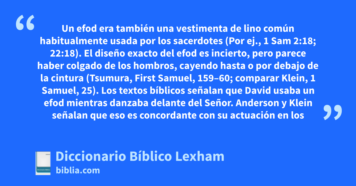 El efod como una vestimenta sacerdotal. Un efod era también una vestimenta de lino común habitualmente usada por los sacerdotes (Por ej., 1 Sam 2:18; 22:18). El diseño exacto del efod es incierto, pero parece haber colgado de los hombros, cayendo hasta o por debajo de la cintura (Tsumura, First Samuel, 159–60; comparar Klein, 1 Samuel, 25). Los textos bíblicos señalan que David usaba un efod mientras danzaba delante del Señor. Anderson y Klein señalan que eso es concordante con su actuación en los sacrificios sacerdotales. (2 Sam 6:14, 17; 1 Crón 15:27; 16:1–2; Anderson, 2 Samuel, 105; Klein, 1 Chronicles, 357; comparar Braun, 1 Chronicles, 191). La afirmación de Mical de que David se había descubierto (2 Sam 6:20) resulta en la sugerencia incorrecta de que el efod es sólo un taparrabos. La acusación de Mical no indica necesariamente que David estaba desnudo (Tidwell, “Linen Ephod”, 505–07; comparar Phillips, “David’s Ephod”, 487); ella podría haber estado refiriéndose exageradamente a la decisión de David de renunciar a su atuendo real normal, o podría estar indicando que como David danzaba, la parte inferior del efod voló y se expuso su cuerpo (Anderson, 2 Samuel, 105).