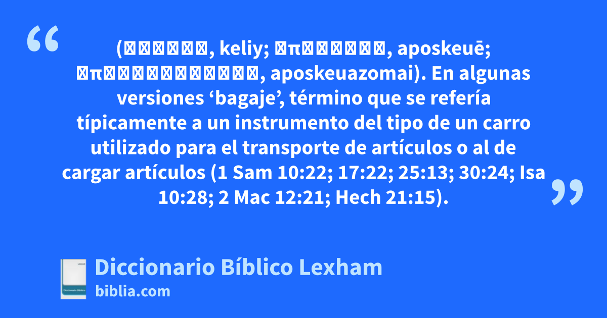 Equipaje (כְּלִי, keliy; ἀποσκευή, aposkeuē; ἀποσκευάζομαι, aposkeuazomai). En algunas versiones ‘bagaje’, término que se refería típicamente a un instrumento del tipo de un carro utilizado para el transporte de artículos o al de cargar artículos (1 Sam 10:22; 17:22; 25:13; 30:24; Isa 10:28; 2 Mac 12:21; Hech 21:15).