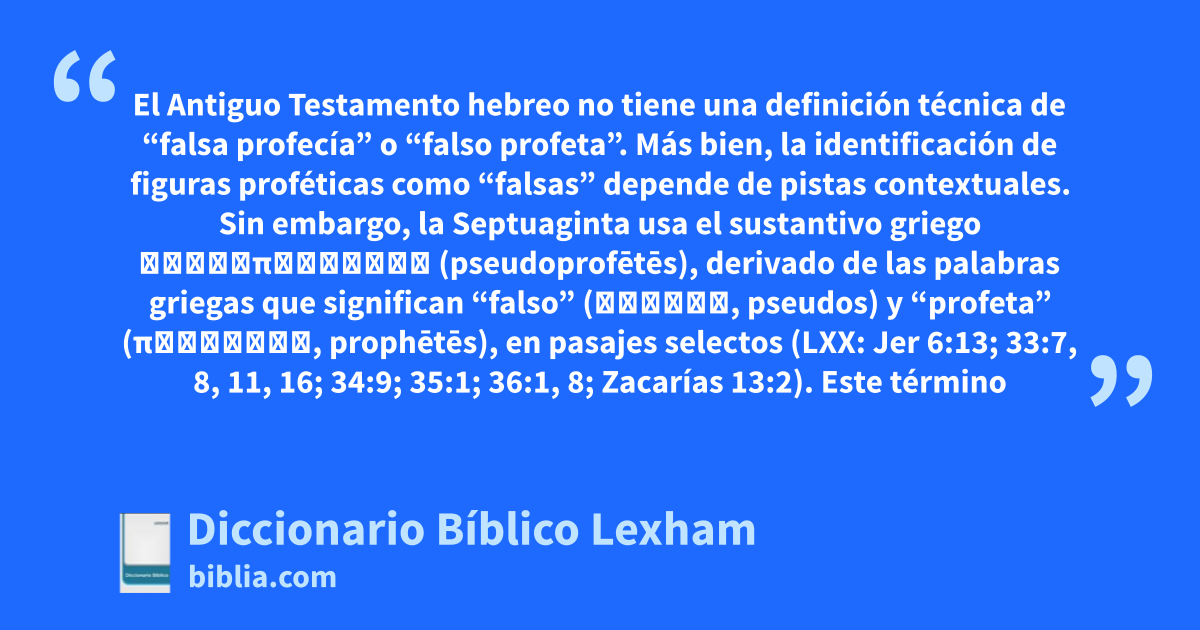 El Antiguo Testamento hebreo no tiene una definición técnica de “falsa profecía” o “falso profeta”. Más bien, la identificación de figuras proféticas como “falsas” depende de pistas contextuales. Sin embargo, la Septuaginta usa el sustantivo griego ψευδοπροφήτης (pseudoprofētēs), derivado de las palabras griegas que significan “falso” (ψεῦδος, pseudos) y “profeta” (προφήτης, prophētēs), en pasajes selectos (LXX: Jer 6:13; 33:7, 8, 11, 16; 34:9; 35:1; 36:1, 8; Zacarías 13:2). Este término griego también aparece en el Nuevo Testamento (Mateo 7:15;24:11, 24; Marcos 13:22; Lucas 6:26; Hechos 13:6; 2 Pet 2:1; 1 Juan 4:1; Apocalipsis 16:13; 19:20; 20:10).