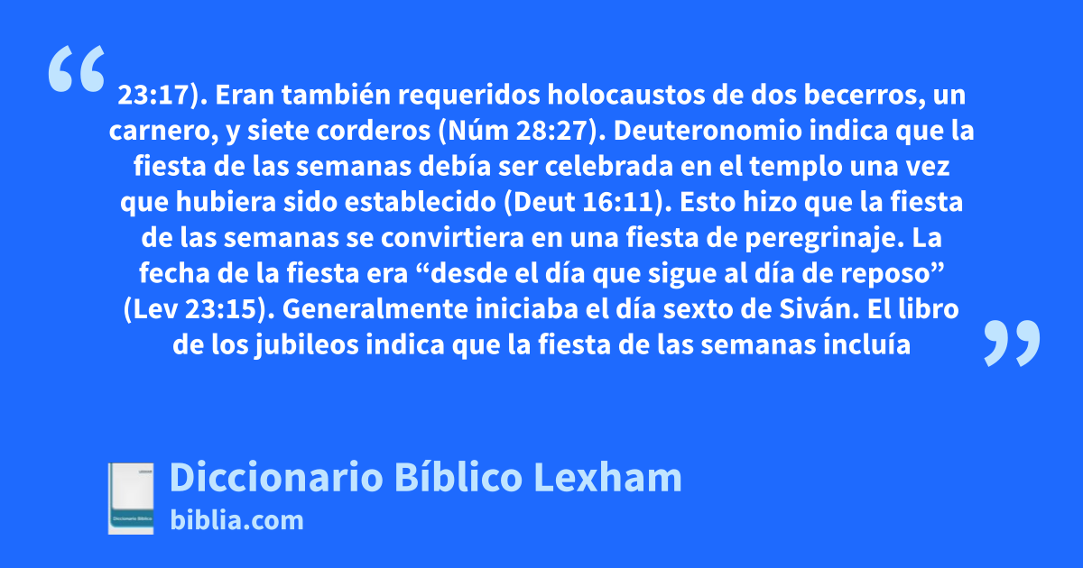 Fiesta de las semanas (Pentecostés). La fiesta de las semanas, también llamada la fiesta de la cosecha o pentecostés, celebraba la cosecha de los granos y la renovación del pacto. Es llamada así por las siete semanas que la separan de la celebración de la Pascua. Celebraba la entrada a la tierra prometida y la abundancia de esa tierra (Lev 23:10).