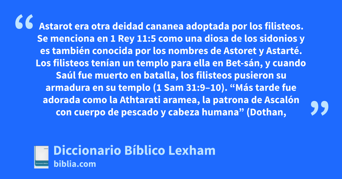 Astarot (עַשְׁתֹּרֶת, ashtoreth, עַשְׁתְּרֹת, ashteroth). Astarot era otra deidad cananea adoptada por los filisteos. Se menciona en 1 Rey 11:5 como una diosa de los sidonios y es también conocida por los nombres de Astoret y Astarté. Los filisteos tenían un templo para ella en Bet-sán, y cuando Saúl fue muerto en batalla, los filisteos pusieron su armadura en su templo (1 Sam 31:9–10). “Más tarde fue adorada como la Athtarati aramea, la patrona de Ascalón con cuerpo de pescado y cabeza humana” (Dothan, Material Culture, 21). Era común para las naciones combinar los dioses o diosas de características similares pero con diferentes nombres, así que ella pudo haber sido una diosa que los filisteos trajeron con ellos y más tarde le dieron un nombre semita.