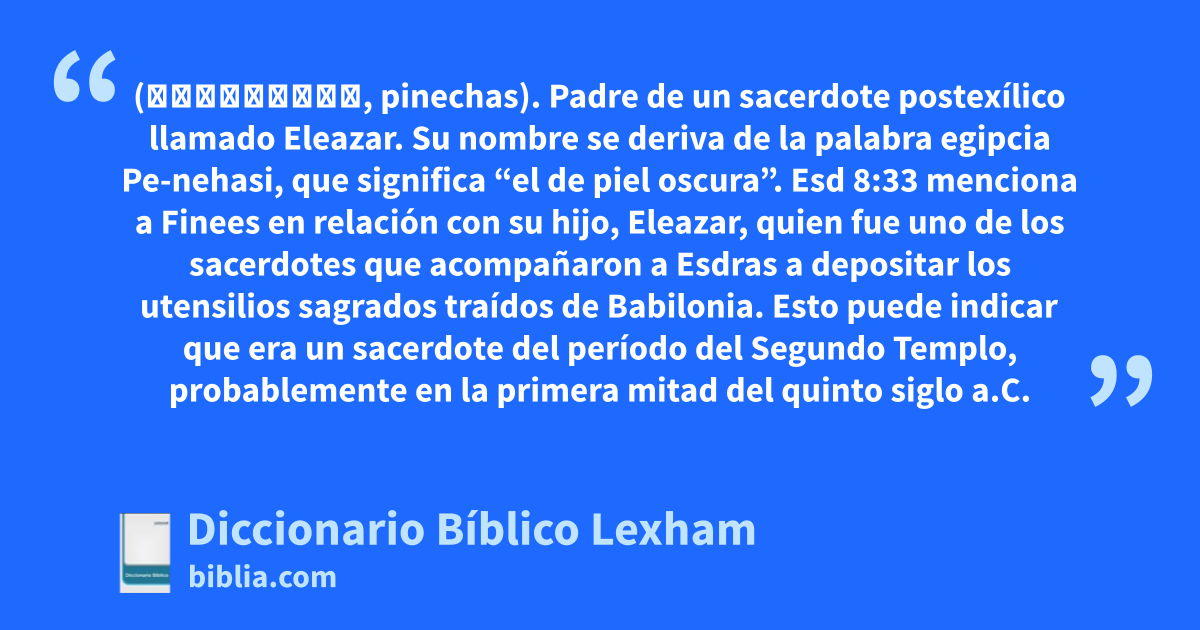 Finees, el sacerdote (פִּינְחָס, pinechas). Padre de un sacerdote postexílico llamado Eleazar. Su nombre se deriva de la palabra egipcia Pe-nehasi, que significa “el de piel oscura”. Esd 8:33 menciona a Finees en relación con su hijo, Eleazar, quien fue uno de los sacerdotes que acompañaron a Esdras a depositar los utensilios sagrados traídos de Babilonia. Esto puede indicar que era un sacerdote del período del Segundo Templo, probablemente en la primera mitad del quinto siglo a.C.
