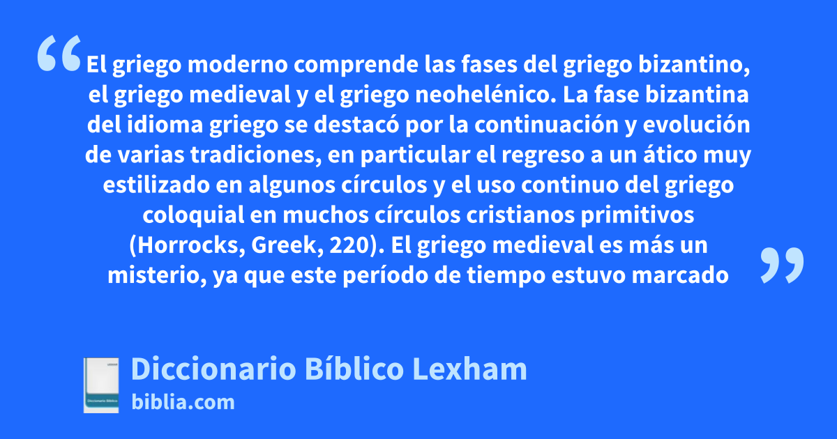 El griego moderno comprende las fases del griego bizantino, el griego medieval y el griego neohelénico. La fase bizantina del idioma griego se destacó por la continuación y evolución de varias tradiciones, en particular el regreso a un ático muy estilizado en algunos círculos y el uso continuo del griego coloquial en muchos círculos cristianos primitivos (Horrocks, Greek, 220). El griego medieval es más un misterio, ya que este período de tiempo estuvo marcado por la agitación política y económica, y la poca escritura registrada en griego es principalmente literaria y puede no indicar el uso coloquial más amplio y los cambios (Browning, Medieval and Modern Greek, 55). Neohelénico es la forma del griego que se usa hoy en día. Es el resultado de la caída de Constantinopla ante el Imperio Otomano en el 1453, lo que resultó en una fragmentación del idioma mientras buscaba recuperarse de cara a la era moderna (Colvin, Brief History, 189).