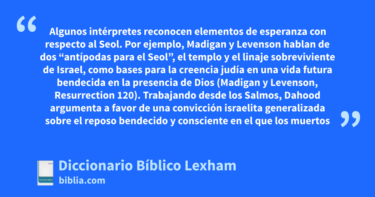 Algunos intérpretes reconocen elementos de esperanza con respecto al Seol. Por ejemplo, Madigan y Levenson hablan de dos “antípodas para el Seol”, el templo y el linaje sobreviviente de Israel, como bases para la creencia judía en una vida futura bendecida en la presencia de Dios (Madigan y Levenson, Resurrection 120). Trabajando desde los Salmos, Dahood argumenta a favor de una convicción israelita generalizada sobre el reposo bendecido y consciente en el que los muertos fieles están: