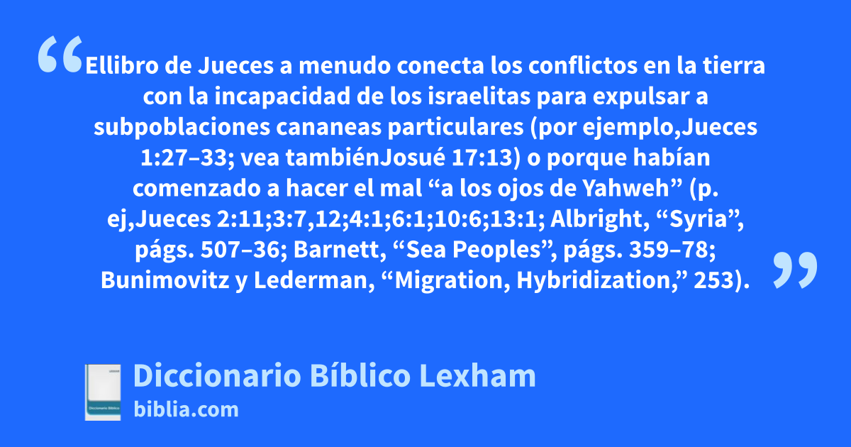 El período de los jueces (ca. 1375–1051 a.C.).Durante el período de los jueces, la situación en Palestina siguió siendo muy similar a como era al final del período de la conquista (compárese Jueces 1:1–2:10; Bunimovitz y Lederman, “Migration, Hybridization”, 252). Dos y media tribus tenían sus posesiones al este del Jordán, y las nueve y media restantes tribus tenían sus posesiones al oeste del Jordán (Leví no recibió ninguna asignación contigua, y Manasés recibió una asignación parcial a cada lado del Jordán). Estas posesiones se extendían desde el área de Dan en el norte (pertenecientes a Neftalí) a Beerseba en el sur (perteneciente a Simeón; Jueces 20:1; 1Sm 3:20;2 Samuel 3:10; 17:11; 24:2,15; 1 Reyes 4:25 [5:5 TM]; 1 Crónicas 21:2; 2 Crónicas 30:5; Rasmussen, Zondervan Atlas of the Bible,114,116). Aunque Dan y Beerseba se asocian típicamente con la extensión más al norte y al sur de la tierra (respectivamente), la parcela de Aser se extendía tan al norte comoSidón (a unas 27 millas al noroeste de Dan;Josué 19:28;Jueces 1:31; Rasmussen, Atlas de la Biblia de Zondervan, 116), y De Judá la parcela se extendía tan al sur como Cades Barnea (a unas 48 millas al suroeste de Beersheba; Josué 15: 3; Rasmussen, Zondervan Atlas of the Bible,114). Las posesiones de los israelitas parecen haber permanecido inestables durante el período de los jueces. Ellibro de Jueces a menudo conecta los conflictos en la tierra con la incapacidad de los israelitas para expulsar a subpoblaciones cananeas particulares (por ejemplo,Jueces 1:27–33; vea tambiénJosué 17:13) o porque habían comenzado a hacer el mal “a los ojos de Yahweh” (p. ej,Jueces 2:11;3:7,12;4:1;6:1;10:6;13:1; Albright, “Syria”, págs. 507–36; Barnett, “Sea Peoples”, págs. 359–78; Bunimovitz y Lederman, “Migration, Hybridization,” 253).