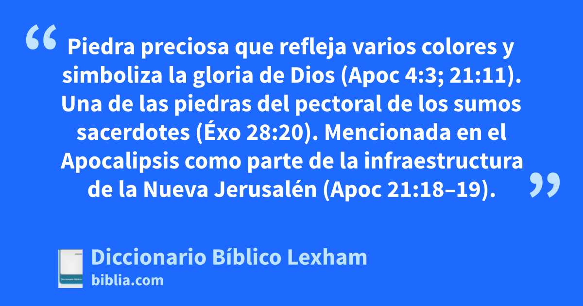 Jaspe Piedra preciosa que refleja varios colores y simboliza la gloria de Dios (Apoc 4:3; 21:11). Una de las piedras del pectoral de los sumos sacerdotes (Éxo 28:20). Mencionada en el Apocalipsis como parte de la infraestructura de la Nueva Jerusalén (Apoc 21:18–19).